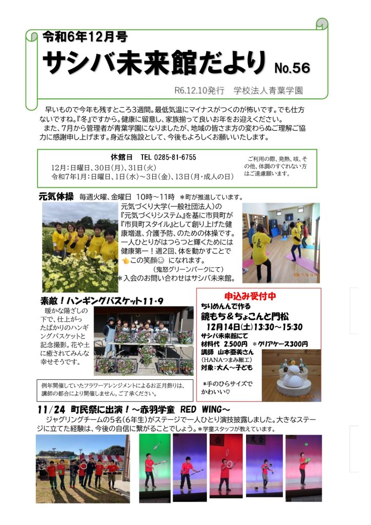 令和6年12月号のサシバ未来館便りをホームページに載せました。